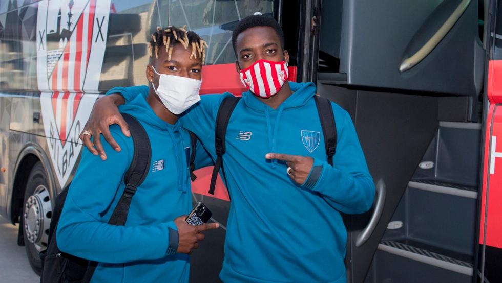 Los hermanos Williams, delante del autobús del Athletic, protegidos con mascarillas (Athletic Club)